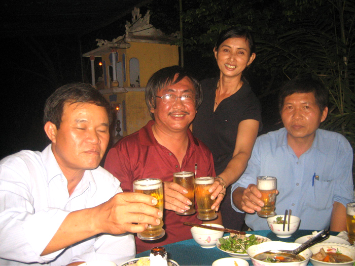 | Thứ tư 18-3-2009, biết Phanxipăng vừa về Huế, Ngô Thọ liền mời đến nhà Đoàn Vĩnh Giáo để xơi cỗ cúng đất. Chuyện trường, chuyện lớp rộn ràng. Kiều nữ áo đen trong hình là Ngô Thị Mão, "bí thư riêng" của Tre Cán Giáo. | |